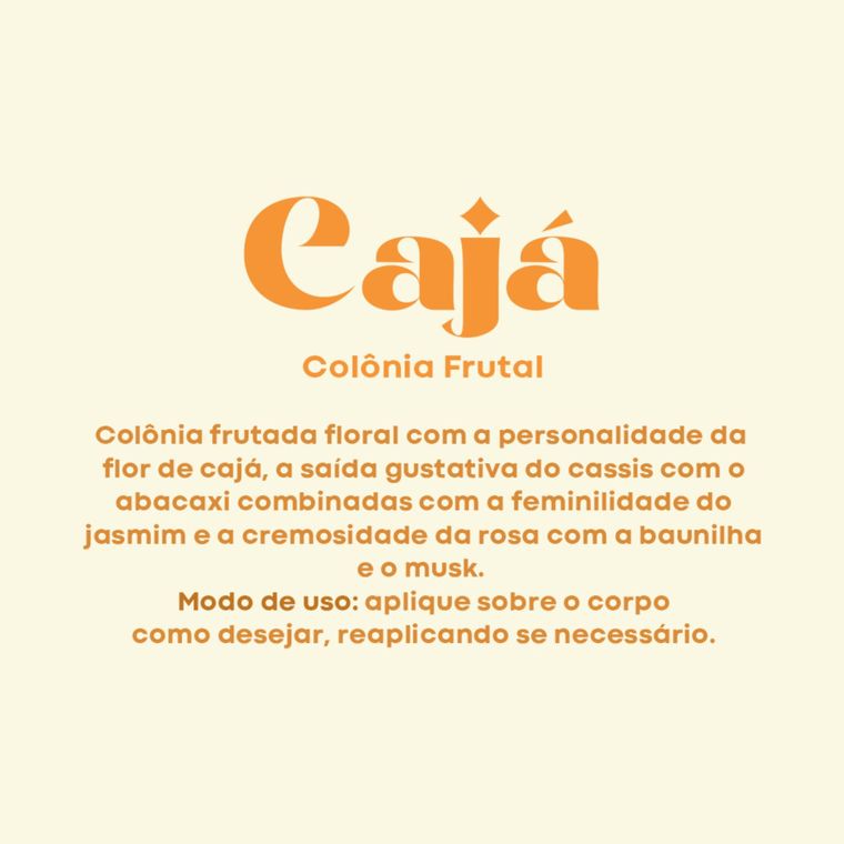 A Colônia Flor de Cajá da Vegetal do Brasil combina frutas tropicais e flores nobres para criar uma fragrância doce, fresca e feminina. A saída gustativa do cassis e do abacaxi contrasta de forma elegante com a personalidade da flor de cajá. Jasmim e rosa trazem delicadeza, enquanto a baunilha e o musk entregam uma finalização cremosa e envolvente.