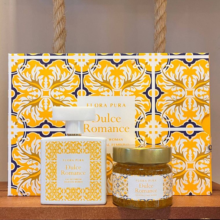 O kit contém uma gelatina hidratante para banho e Perfume Dulce Romance 100ml.