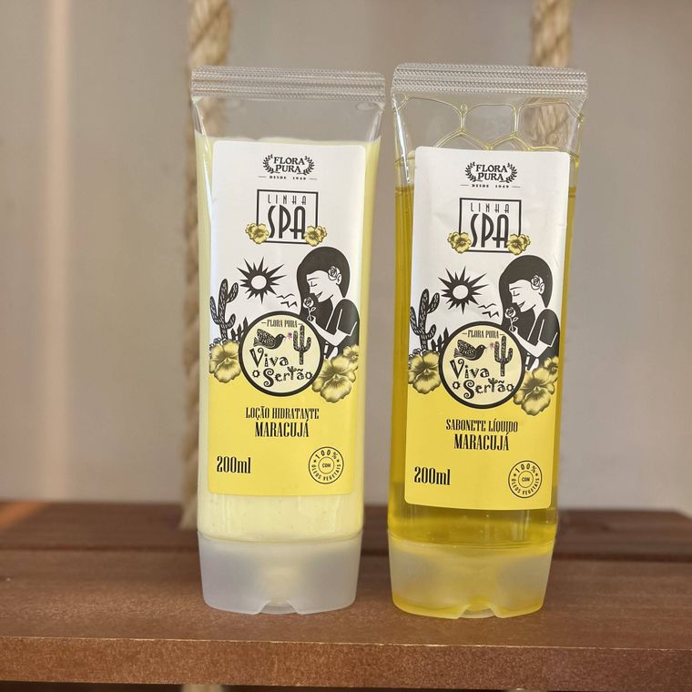 O kit contém sabonete e loção hidratante de maracujá linha Viva o Setão Flora Pura.