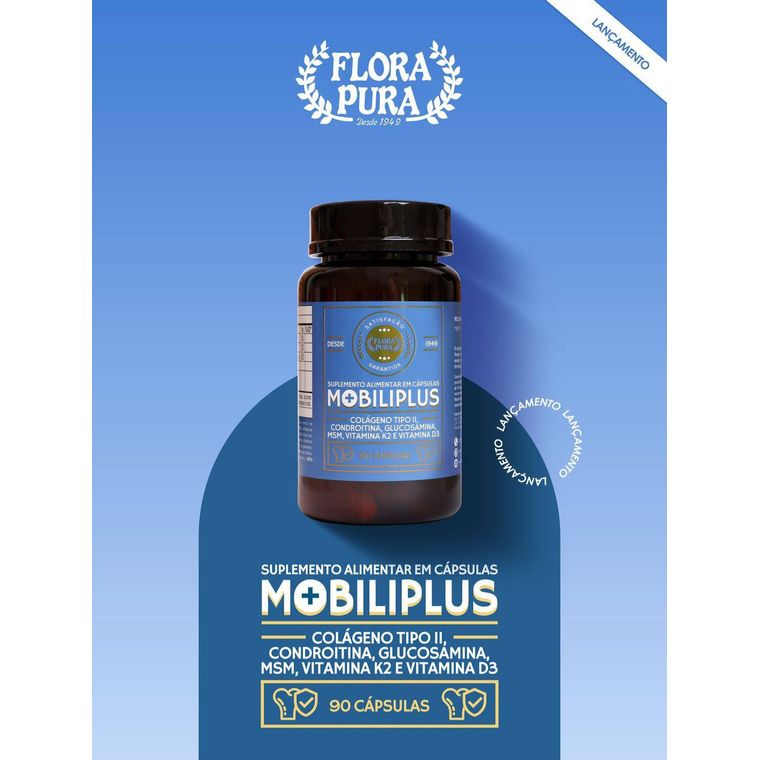 O suplemento MOBILIPLUS da Flora Pura é formulado com colágeno tipo Il, glucosamina, condroitina, MSM (metilsulfonilmetano), vitamina K2 e vitamina D3.