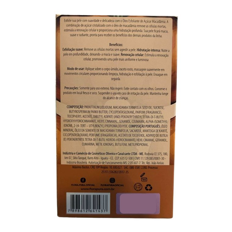 Transforme seu momento de autocuidado com o Óleo Esfoliante de Açúcar Macadâmia Flora Pura. Desenvolvido com cristais de açúcar combinados ao óleo de macadâmia, ele remove delicadamente as células mortas, estimulando a renovação celular e deixando a pele macia, uniforme e radiante.