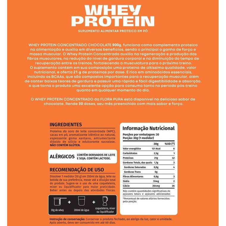 O WHEY PROTEIN CONCENTRADO da FLORA PURA está disponível no delicioso sabor de chocolate. Rende 30 doses, seu mês preenchido com mais sabor e força.